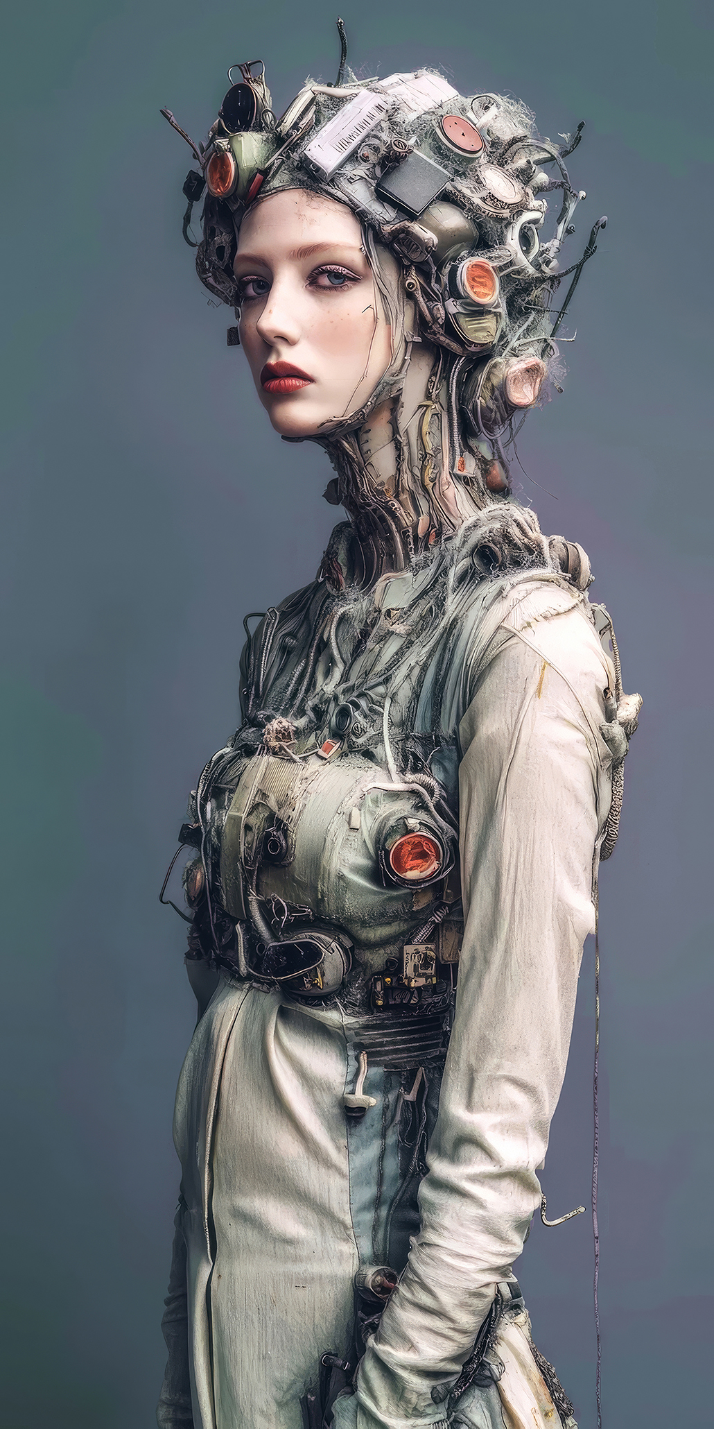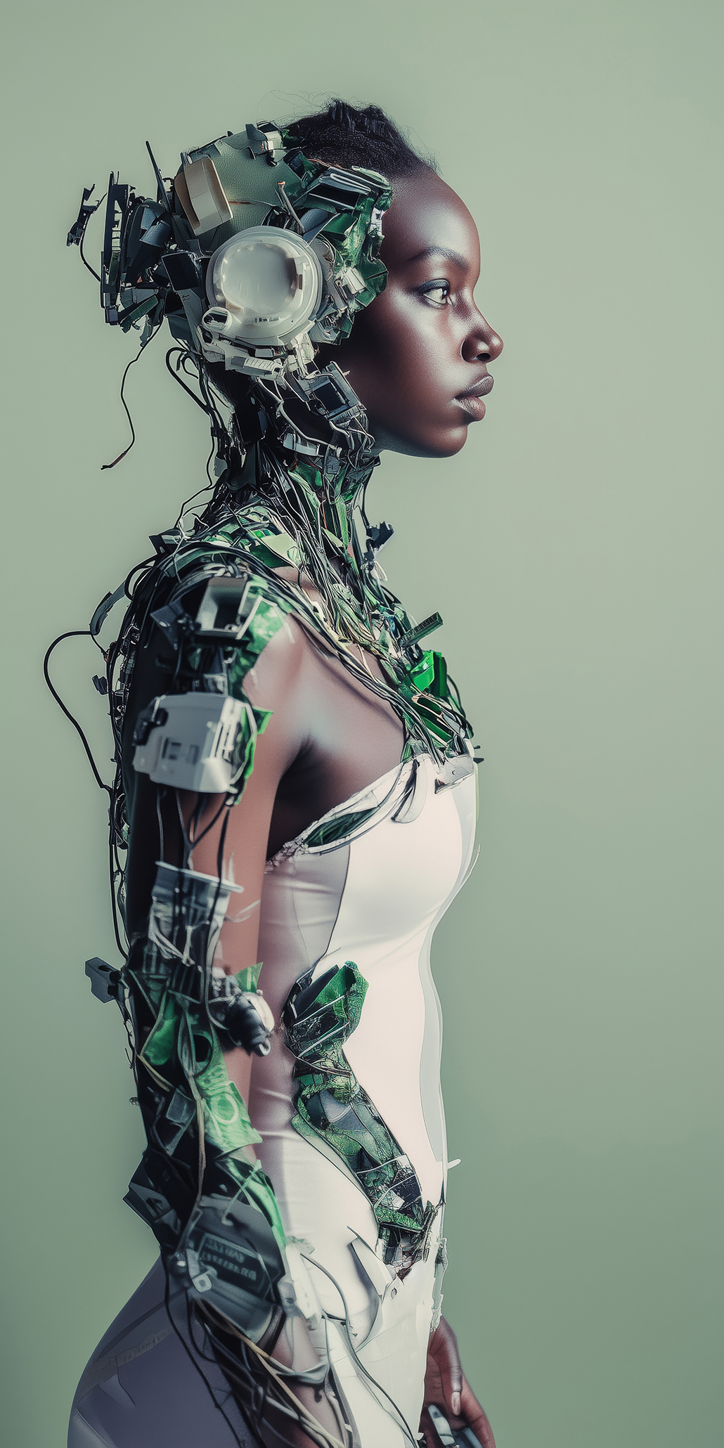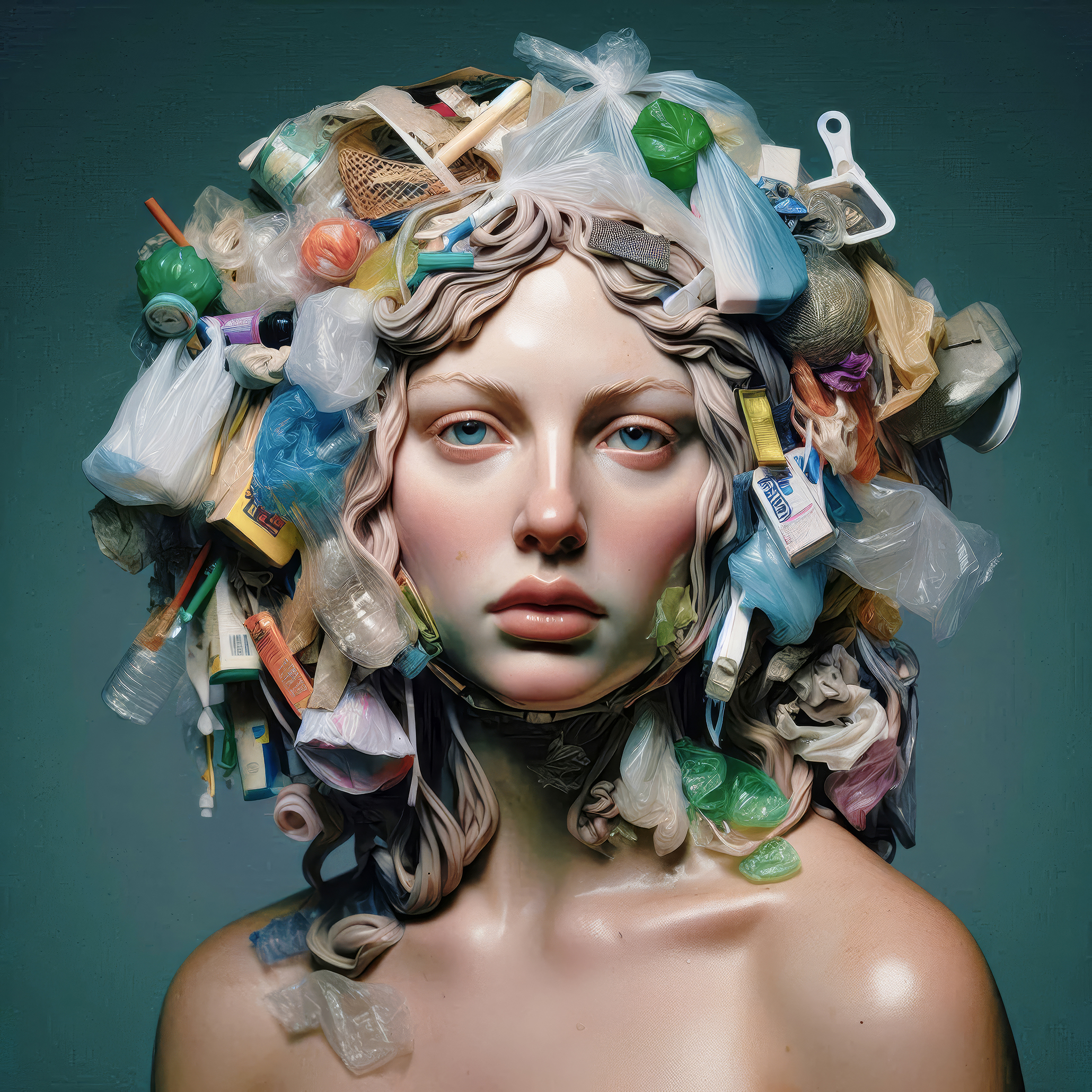 All’interno del progetto si individuano due grandi filoni espressivi: il primo più dinamico caratterizzato da tratti eterei e rarefatti, dominato da una tavolozza di colori freddi dove la resa della rifrazione luministica tra acqua e plastica crea un groviglio di oggetti di scarto che l’occhio umano fatica a mettere a fuoco singolarmente per via della resa dettagliatissima. Mentre il secondo, più statico, cita inequivocabilmente la scultura classica e la pittura barocca dove l’elemento sintetico non è più fuso con la pelle bensì costruisce una struttura architettonica che circonda il volto. Attestando la capacità dell’AI di diversificare le varie texture che in questo frangente assumono una finitura simile alla porcellana o al marmo levigato. La luce non è più diffusa ma teatrale e focalizzata sul viso per accentuarne la profondità dei tratti.